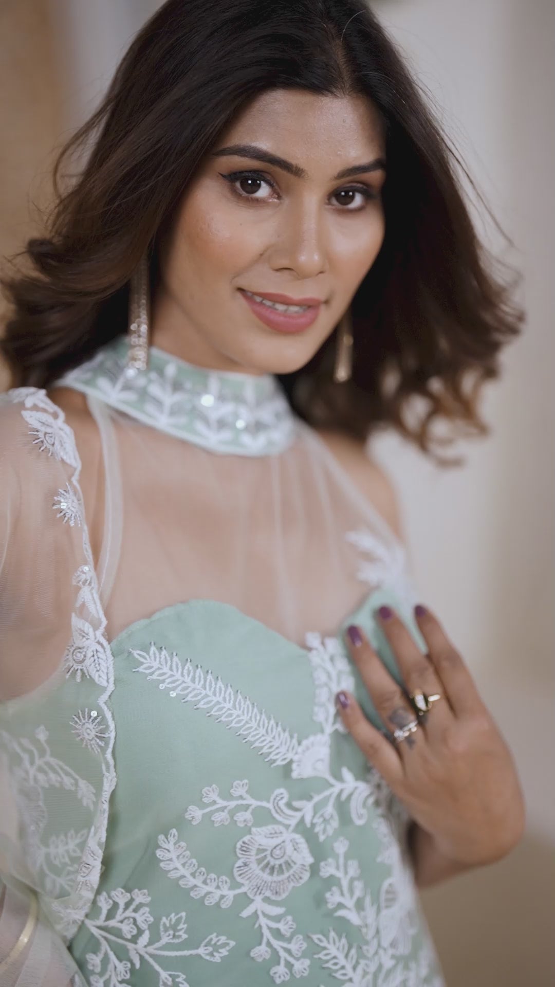 A-Symetrical Light Green Colour Butterfly Net Top With Embellishment Plazzo & Dupatta