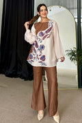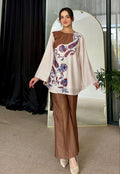 The top features a relaxed, wide-sleeved design in soft cream with a bold contrast panel of warm mocha brown at the neckline.