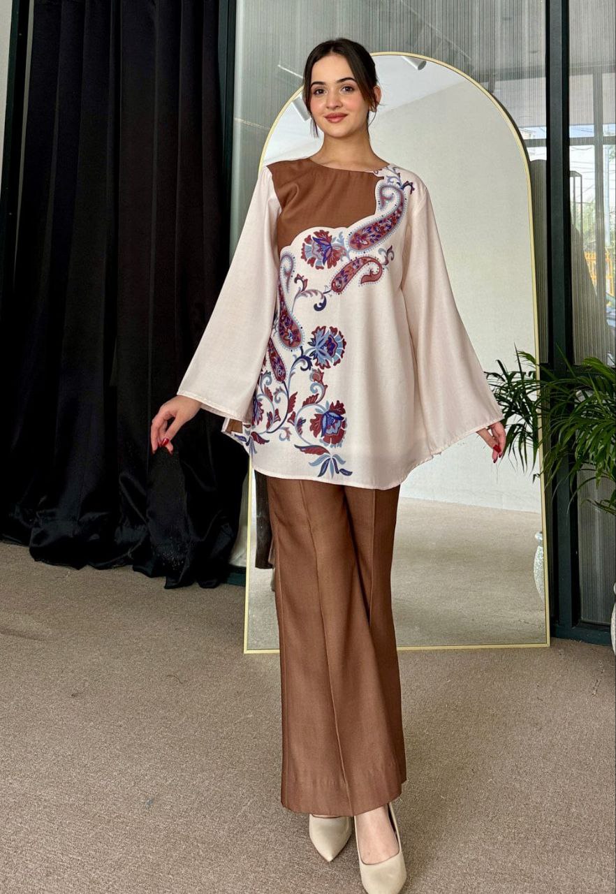 The straight-cut mocha brown trousers provide a sleek foundation, balancing the flowy top with structure and elegance.