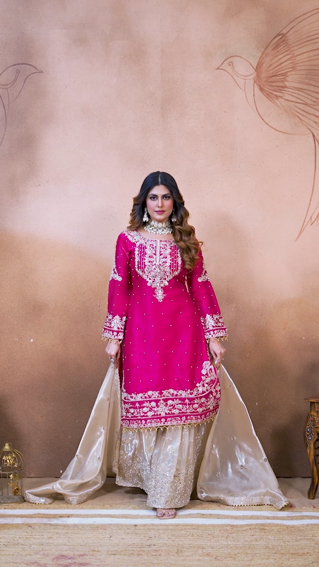 Presenting the new designer collection in pure heavy Jimmy Choo silk with heavy embroidery coding dori and sequin work. This fully stitched top, bottom and dupatta set is ready to wear.