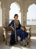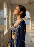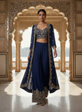 This exquisite ethnic ensemble showcases a beautifully embroidered crop top paired with flowy palazzo pants and an elegant jacket-style layer, creating a perfect blend of tradition and modern design.