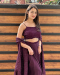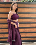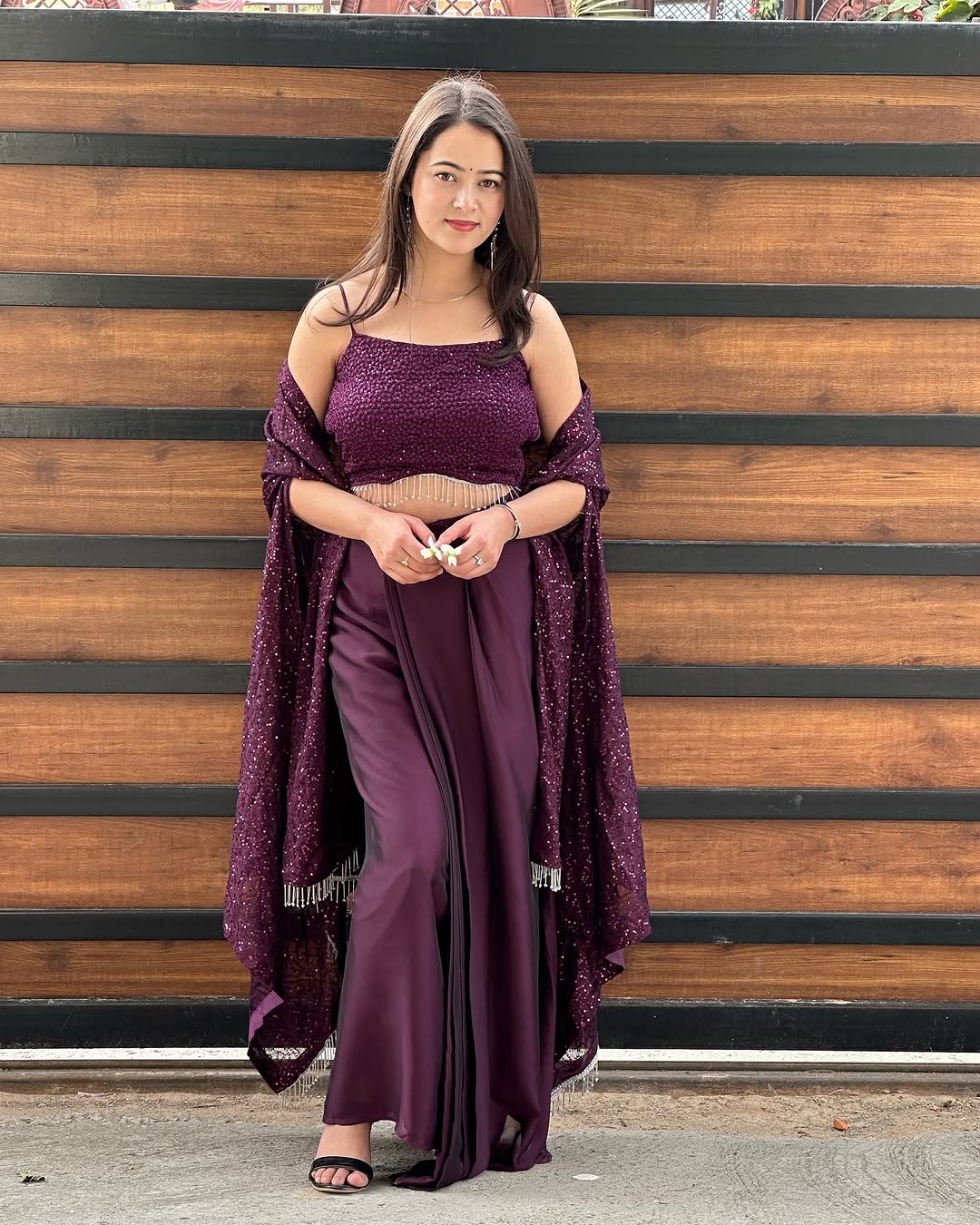 Draped Skirt: Crafted from Fiona silk, this draped skirt features elegant embroidery and a full flair for a graceful look. Free size and fully stitched.