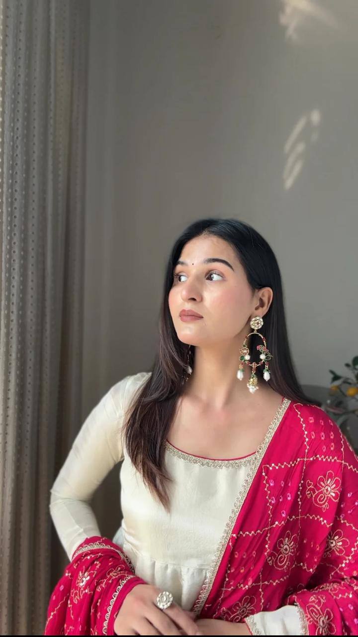 ✨ Exclusive 3 Piece Chinon Gown Set with Plazzo & Printed Dupatta