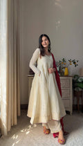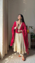 Elevate your festive look with this premium Chinon gown set, crafted with golden lace details and paired with a matching plazzo and printed dupatta. Perfect for weddings, parties, and special celebrations, this elegant outfit blends comfort with style effortlessly.