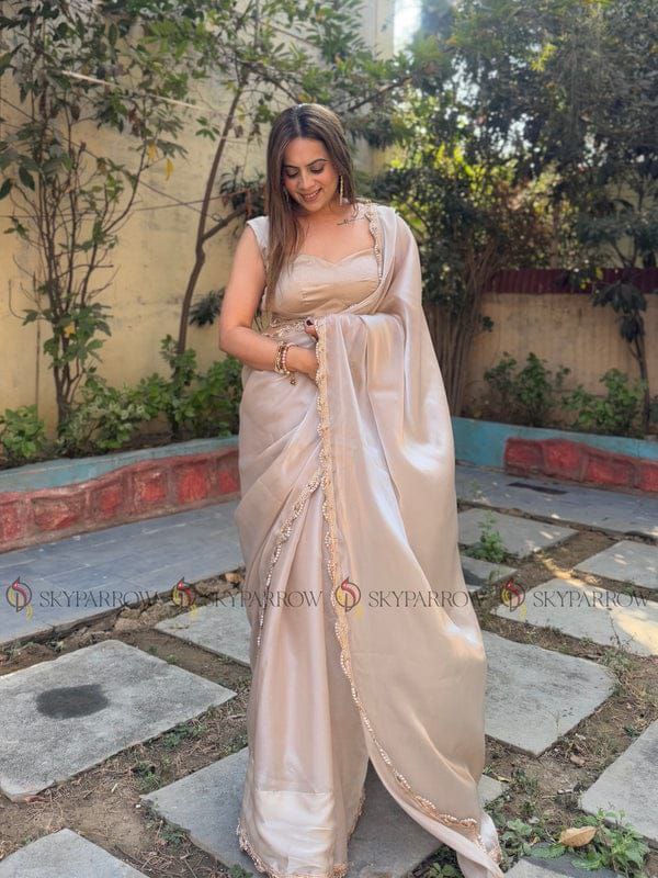 Introducing our latest launch from the Sparrow catalogue — a premium saree crafted for elegance and grace. Designed in rich tissue silk fabric, this saree features a solid body enhanced with delicate pearl dori weaving and a refined golden lace border. The luxurious drape and subtle detailing make it an ideal choice for festive occasions, parties, and special events.
