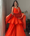 The outfit features a beautifully flowy silhouette paired with a richly embroidered dupatta that adds a touch of luxury.