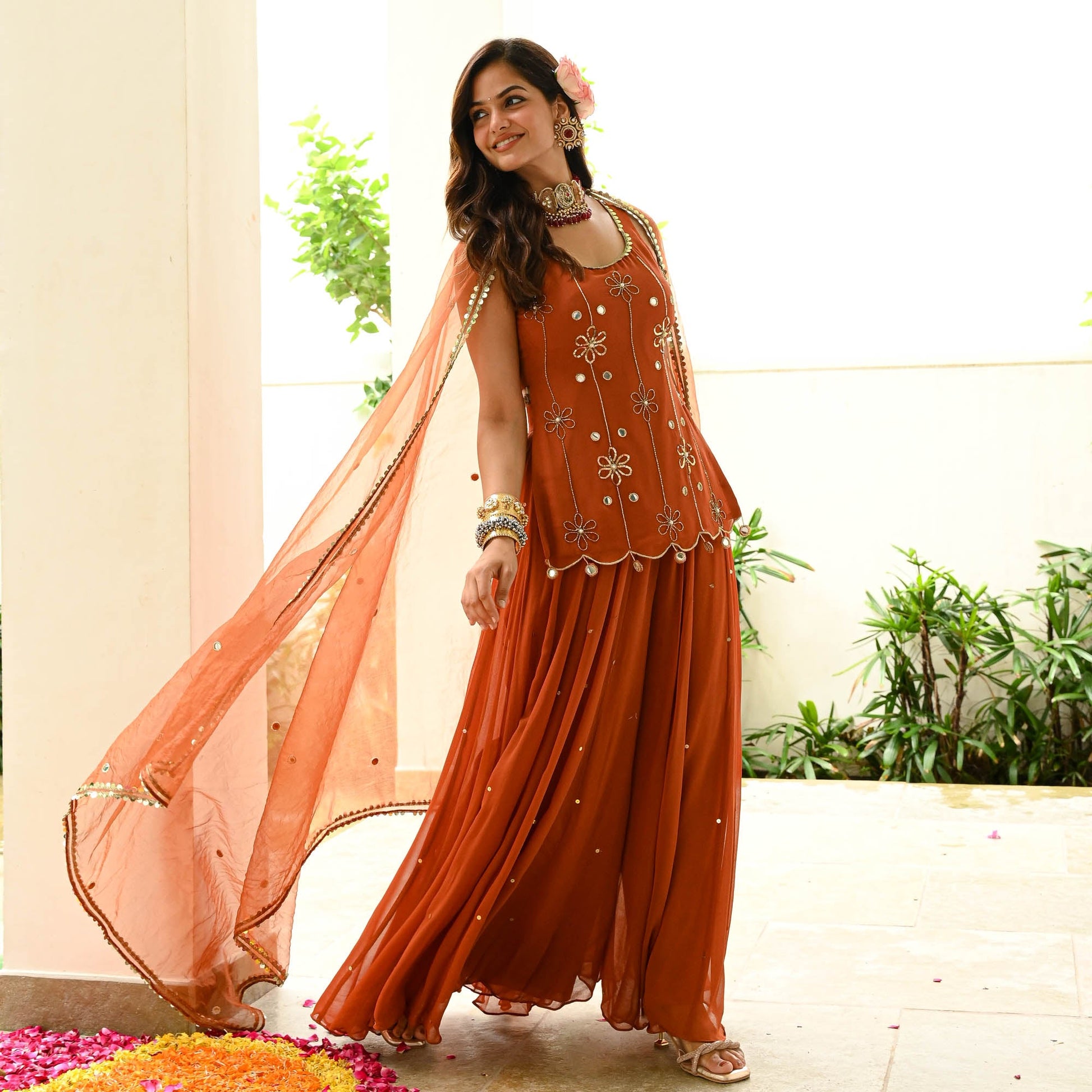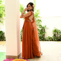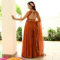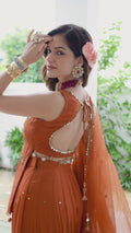 Radiating festive elegance in rich rust orange georgette, this Anarkali Suit Set features a sleeveless, fitted bodice adorned with delicate floral embroidery, mirror accents, and refined embellishments. The graceful flare adds fluid movement, while the stylish back cut-out detail enhances its contemporary appeal. Paired with a lightweight sheer dupatta finished with subtle border detailing, this ensemble creates a timeless yet modern festive look perfect for weddings and celebrations.